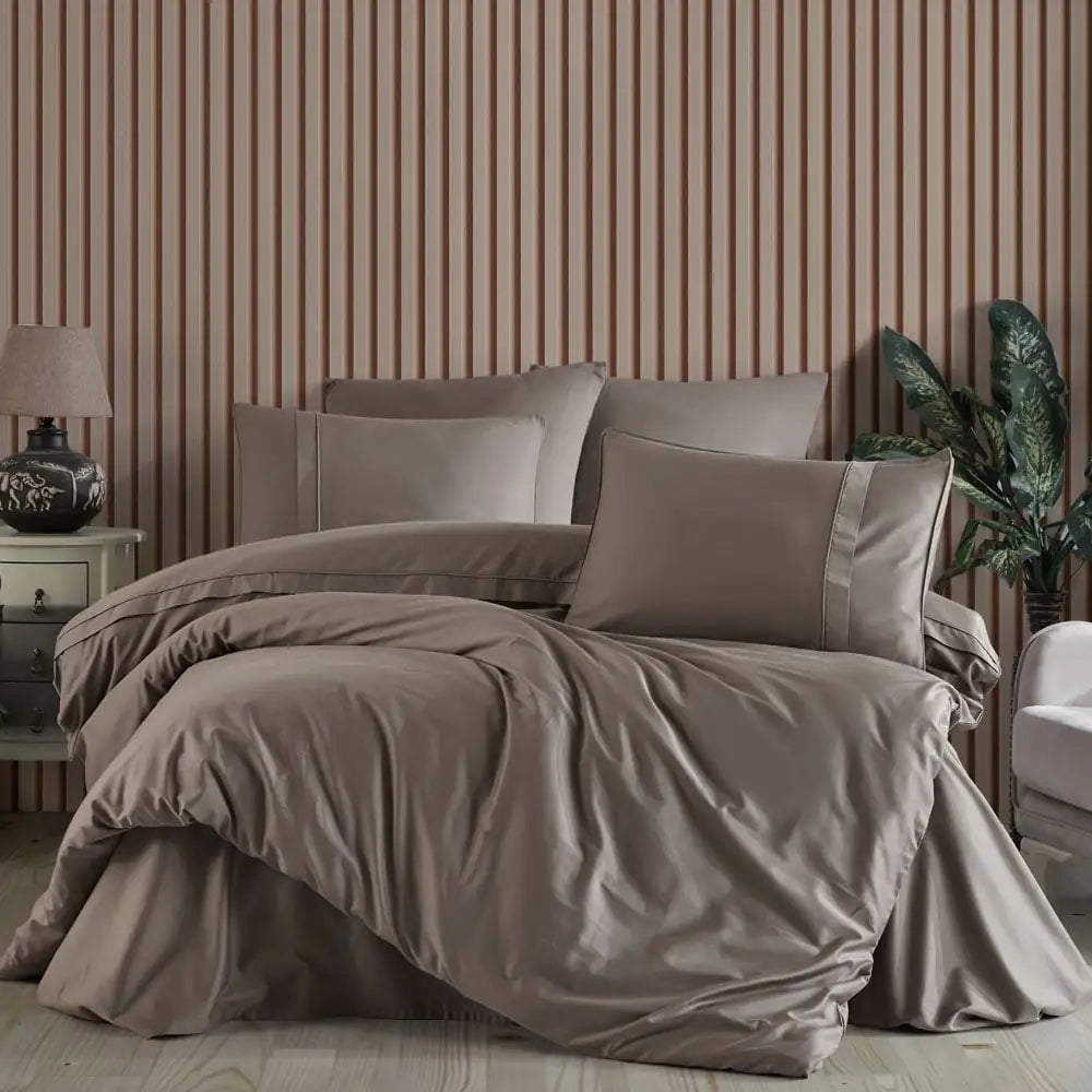 Double Satin Duvet Cover Set Our Double Satin duvet cover set is made of 100% cotton yarn, cotton satin and ultra-soft fabric. There are 300 tc of wire thread in 1 cm2. Our satin duvet cover sets are lightweight and soft to the touch. Therefore, it is skin-friendly while giving a silky feeling. Again, our satin duvet cover sets breathe with their air permeability and do not cause sweating. Satin duvet cover has a brighter and flowing structure because it goes through a more frequent weaving process than other types of weaving. Due to the use of long fiber fabric in the yarn of this product, the duvet cover is durable and long-lasting. Our duvet cover set will improve your sleep quality with its smooth and soft texture and bring elegance to your room with its different models. The duvet cover set is sent with its original box and packaging. Package Content: Double Satin Duvet Cover Set 1 Duvet Cover 1 Bed Sheet 2 Pillow Cases 50*70 2 Pillow Cases 70*70 Production Place: Turkey, Denizli Washing Instructions Wash your products in the machine at 40 0C on a delicate program or by hand with plenty of water. Wash with . We recommend that you use colormatic detergent when washing. Iron the duvet cover sets with a warm iron. Do not leave the product wet. When washing, wash light and dark colors separately. Never use bleach or bleaching cleaning agents. Wash the products in your machine without squeezing them. It may deform when you compress it while full. Wash and dry the products that have been kept waiting for any reason before drying them. Do not dry your products at high temperatures. Wash and iron all parts of the duvet cover sets before use.